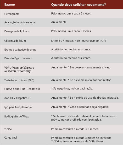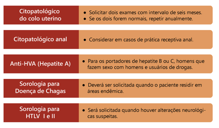 Aos pacientes soropositivos, acompanhados pela equipe de saúde, deverão ser solicitados, na primeira consulta, os exames listados no quadro a seguir: