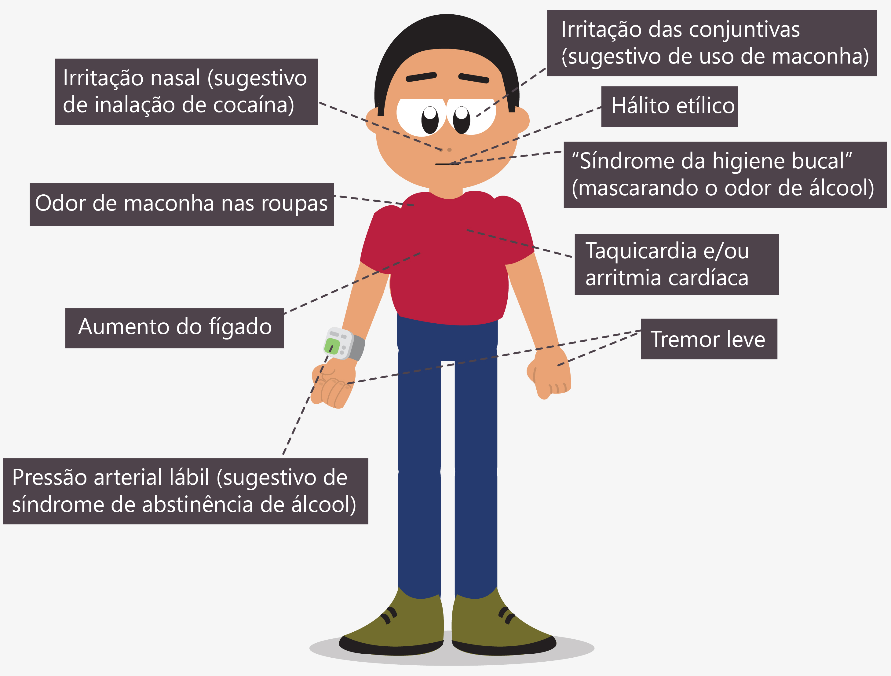 A EMAD deve identificar, a cada visita, os sinais físicos sugestivos do uso de álcool e drogas no caso de o paciente apresentar recaídas MARQUES; RIBEIRO, 2003a):