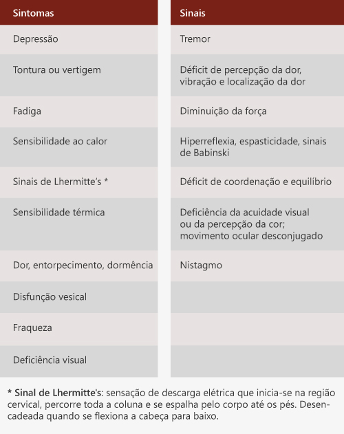 *Sinal de Lhermitte's: sensação de descarga elétrica que inicia-se na região cervical, percorre toda a coluna e se espalha pelo corpo até os pés. Desencadeada quando se flexiona a cabeça para baixo.