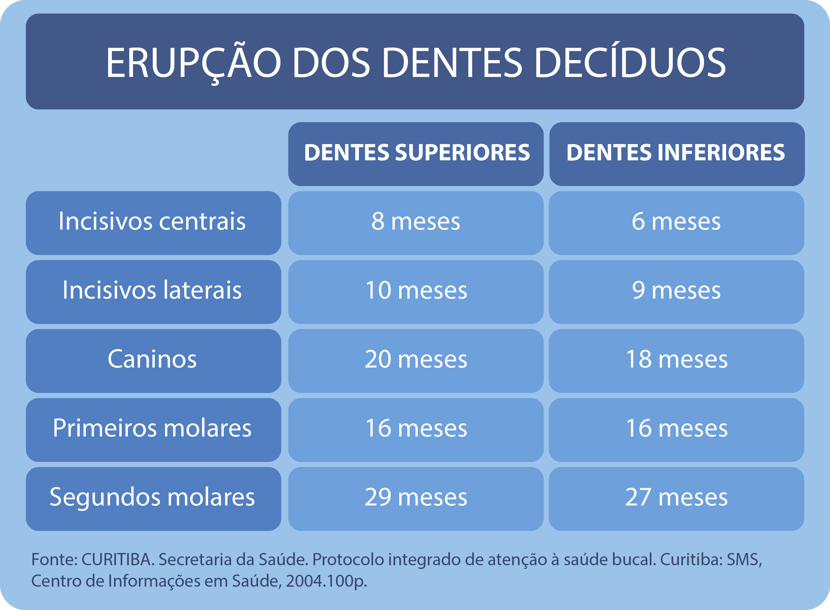 Vale ressaltar que no Brasil, onde ocorre uma grande mistura de raças, a cronologia torna-se bastante variável, mas pode-se dizer que, em média, inicia-se por volta do 6º mês de vida (CURITIBA, 2004). Veja abaixo o quadro sobre a cronologia de erupção dos dentes decíduos.