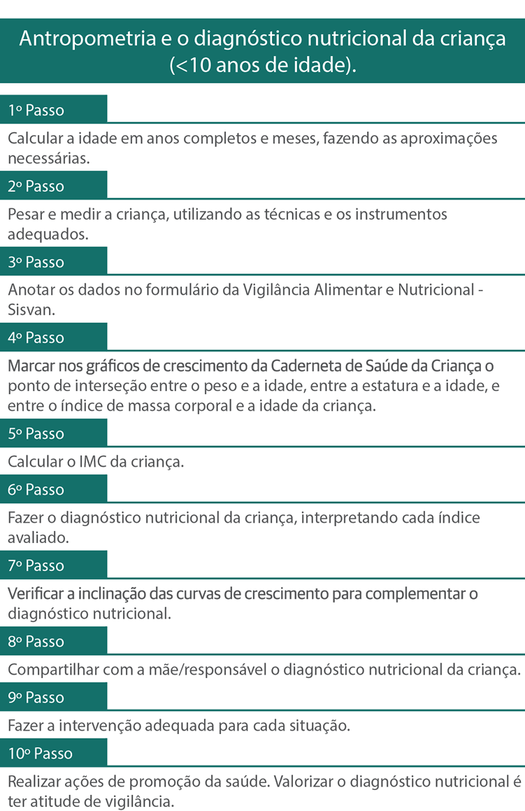 Adaptado de: BRASIL. Ministério da Saúde. Secretaria de Atenção à Saúde. Orientações para a coleta e análise de dados antropométricos em serviços de saúde: norma técnica do Sistema de Vigilância Alimentar e Nutricional - SISVAN. Brasília, DF: Ministério da Saúde, 2011. 76 p. (Série G. Estatística e Informação em Saúde).