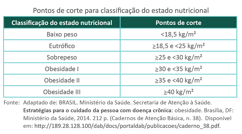A classificação da obesidade para adultos pode ser calculada com o peso e a altura através da fórmula, já vista anteriormente, do IMC.