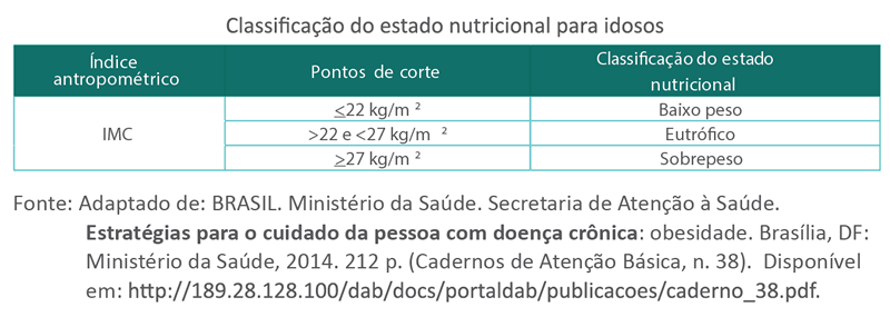 O idoso vai compreender toda a faixa etária igual ou superior a 60 anos e para classificação da obesidade em idosos é necessário o cálculo do IMC e avaliação dos pontos de corte.