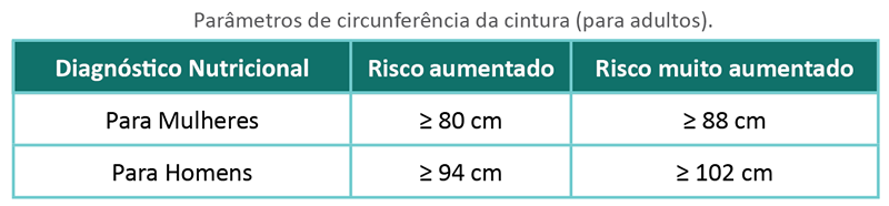 Além do cálculo do IMC, deve também ser realizado em pacientes com excesso de peso (IMC >25 kg/m2), a medida da circunferência, pois permite identificar a localização da gordura corporal, já que o padrão de distribuição do tecido adiposo em indivíduos adultos tem relação direta com o risco de morbimortalidade (BRASIL, 2011). Clique aqui para ver um quadro com os parâmetros de circunferências da cintura.