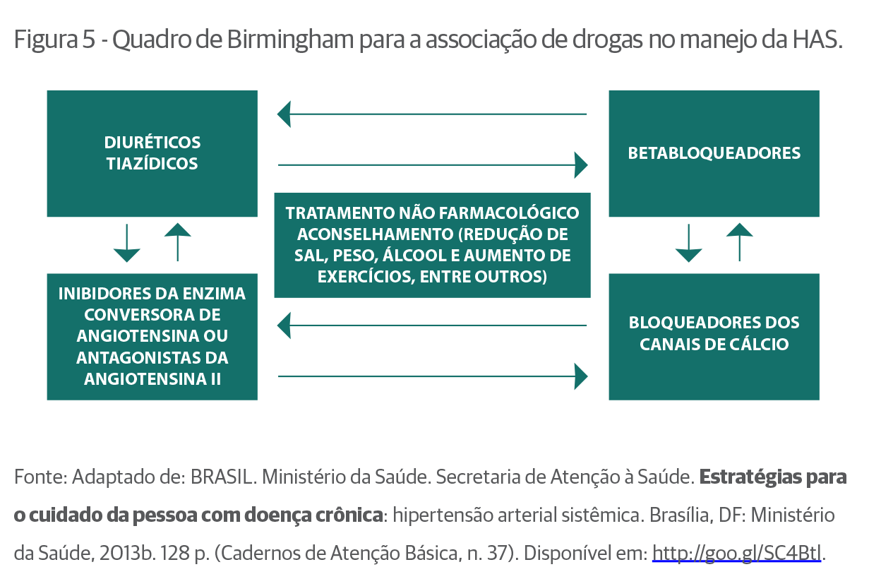 Em alguns casos há necessidade de associar o uso de medicamentos anti-hipertensivos. Desse modo as informações propostas por Birminghan e sintetizadas no quadro abaixo auxiliam a nortear o uso racional de associações de anti-hipertensivos no manejo da HAS. A escolha da medicação associada deverá seguir a conexão entre os fármacos abaixo (clique para ampliar):