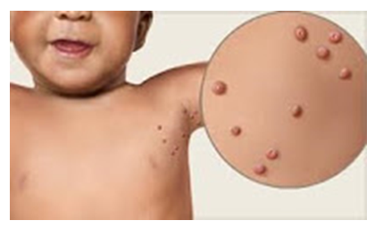 É uma doença de curso benigno causada pelo poxvírus, cujas lesões caracterizam-se pelo formato “umbilicado”, da cor da pele, com aspecto perolado, pequenas (2 a 5 mm) e com uma depressão no centro.