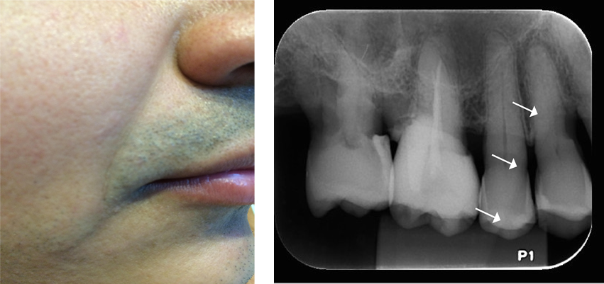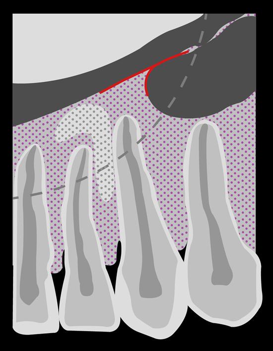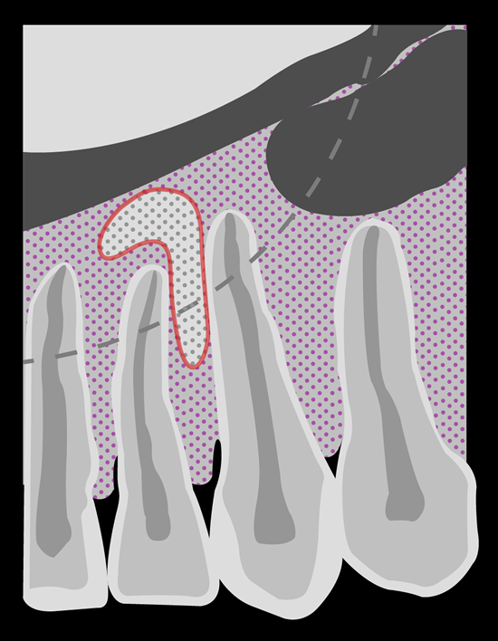 O sulco nasolabial é um espesso tecido da bochecha sobreposto aos dentes e ao processo alveolar e torna-se mais evidente com o avanço da idade. Radiograficamente, estende-se da região do canino à região de pré-molares.