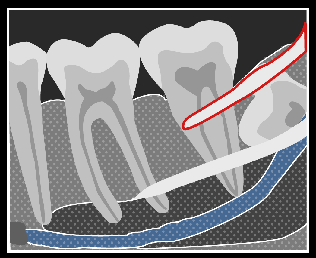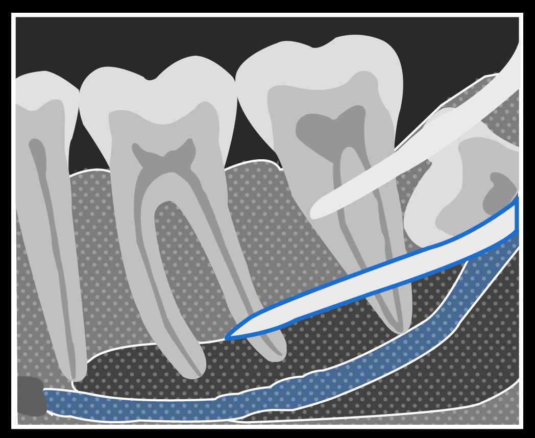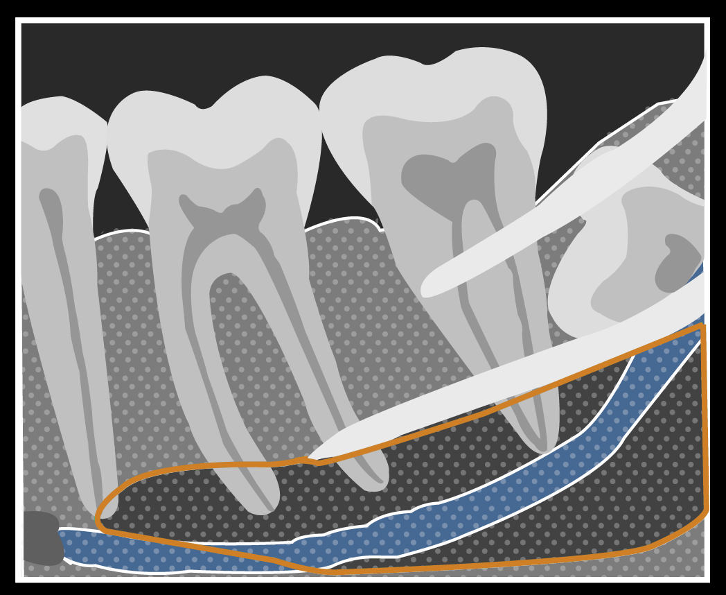 A linha milo-hióidea é observada de forma radiopaca na radiografia, assume o trajeto quase paralelo à linha oblíqua externa, abaixo dos ápices dos dentes molares inferiores.