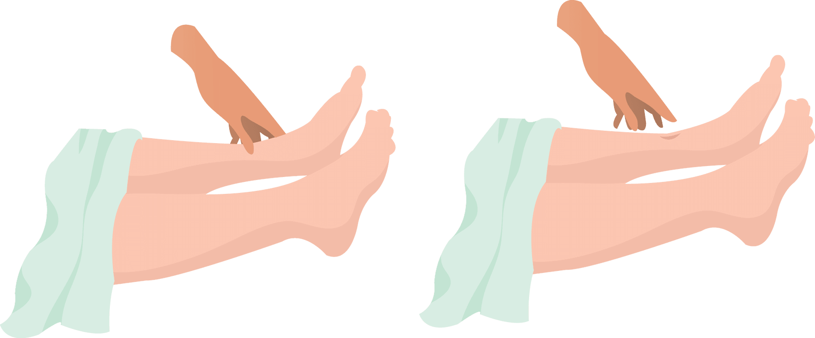 Pressione a pele da área a ser examinada com o dedo polegar, na presença de edema a pele manterá a forma concava, no local pressionado, por alguns segundos.