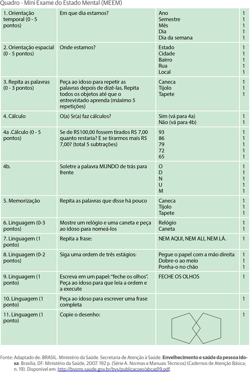 BRASIL. Ministério da Saúde. Secretaria de Atenção à Saúde. Envelhecimento e saúde da pessoa idosa. Brasília, DF: Ministério da Saúde, 2007. 192 p. (Série A. Normas e Manuais Técnicos) (Cadernos de Atenção Básica; n. 19). Disponível em: http://bvsms.saude.gov.br/bvs/publicacoes/abcad19.pdf. Acesso em: 20 maio. 2014.