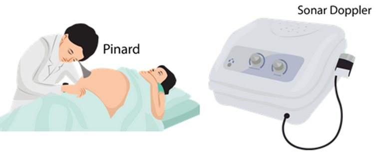 Ausculta dos batimentos cardíacos do feto pode ser realizada com estetoscópio de Pinard (após 20 semanas), ou Sonar Doppler (após 12 semanas). O objetivo é constatar, a cada consulta, a qualidade do BCF, por meio da avaliação de seu ritmo e frequência.