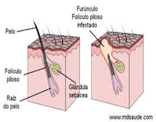 O furúnculo é uma infecção que atinge o folículo piloso e a glândula sebácea. O agente etiológico é o Staphylococcus aureus e as áreas mais afetadas são face, pescoço, axilas, coxas e nádegas.
