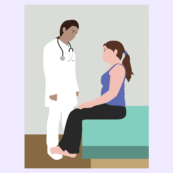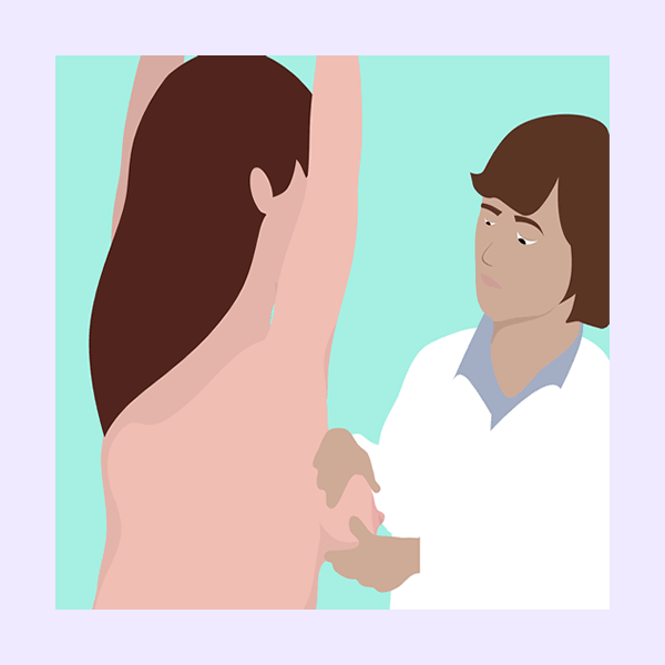 Palpação: Com a paciente sentada, realiza-se a palpação das fossas supraclaviculares e infraclaviculares e região axilar. Com a paciente em decúbito dorsal e mãos na nuca, realiza-se a palpação de forma “dedilhada” nas mamas e em sentido horário.